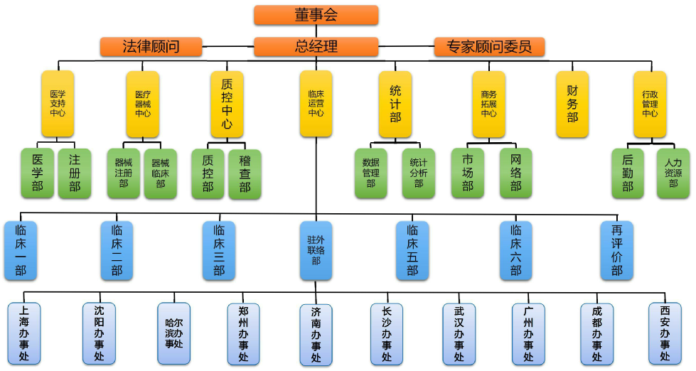 北京遠博醫藥CRO現有員工近兩百人,包括博士、碩士、本科和專科,專業涵蓋了臨床醫學、藥學、預防醫學、護理學、中醫藥學、衛生統計學、市場營銷、人力資源、財務及行政管理等。公司設有:總經理室、商務拓展中心(負責公司業務的市場開發及商務拓展)、醫學支持中心(主要對項目進行調研,提供技術支持)、臨床運行中心(負責項目的具體運行,包括項目的監查管理等)、質量控制部(負責項目的稽查,嚴格控制項目的質量,直接對客戶負責)、數據管理統計分析部(全過程進行數據質量監控)、注冊部(負責與CFDA、CDE、CMDE、CDR一ADR、中檢院和中保辦等的溝通聯絡)、檔案室(項目資料的收集與保管)、人力資源部、財務部和行政辦公室等部門,除北京總部外,北京遠博另在十多個城市設有辦事處,駐辦事處人員長期在以上區域,負責這些區域項目的監查(CRA)及協助醫生(CRC)完成臨床試驗。